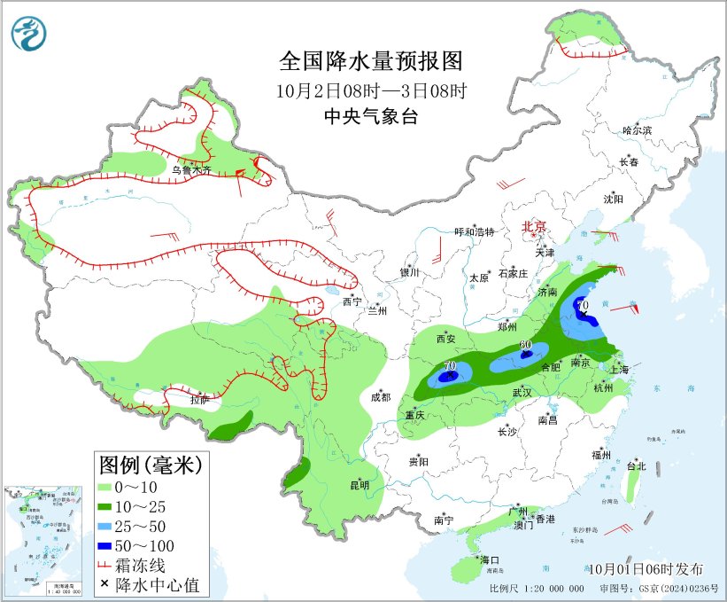 10月2日08时至3日08时,山东中南部、江苏大部、安徽中北部、河南南部、湖北中北部、重庆中北部、四川东北部等地部分地区有中到大雨,其中,山东南部、江苏北部、河南南部、重庆北部等地部分地区有暴雨(50~70毫米)。内蒙古中西部、辽东半岛、山东半岛等地部分地区有4~6级风;黄海中南部海域将有6~8级、阵风9级的大风。