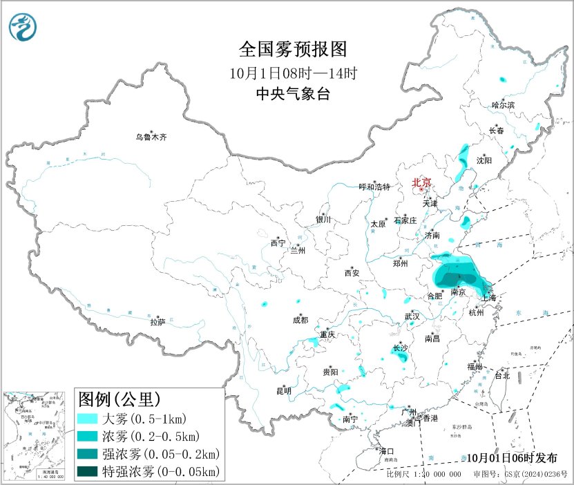 预计,10月1日早晨至上午,山东西南部和东部、江苏、安徽东北部、上海、湖南中部、辽宁西部等地的部分地区有大雾,局地有能见度低于200米的强浓雾。中央气象台10月1日06时继续发布大雾黄色预警。