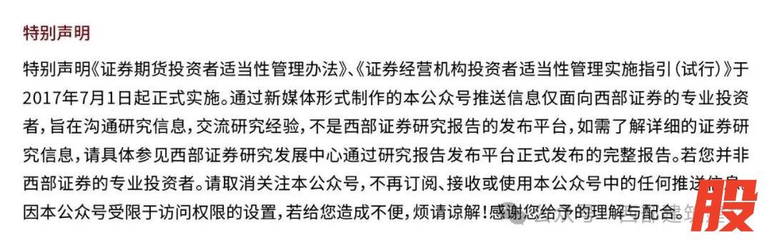 免责声明:本报告由西部证券股份有限公司(已具备中国证监会批复的证券投资咨询业务资格)制作。本报告仅供西部证券股份有限公司(以下简称“本公司”)机构客户使用。本报告在未经本公司公开披露或者同意披露前,系本公司机密材料,如非收件人(或收到的电子邮件含错误信息),请立即通知发件人,及时删除该邮件及所附报告并予以保密。发送本报告的电子邮件可能含有保密信息、版权专有信息或私人信息,未经授权者请勿针对邮件内容进行任何更改或以任何方式传播、复制、转发或以其他任何形式使用,发件人保留与该邮件相关的一切权利。同时本公司无法保证互联网传送本报告的及时、安全、无遗漏、无错误或无病毒,敬请谅解。本报告基于已公开的信息编制,但本公司对该等信息的真实性、准确性及完整性不作任何保证。本报告所载的意见、评估及预测仅为本报告出具日的观点和判断,该等意见、评估及预测在出具日外无需通知即可随时更改。在不同时期,本公司可能会发出与本报告所载意见、评估及预测不一致的研究报告。同时,本报告所指的证券或投资标的的价格、价值及投资收入可能会波动。本公司不保证本报告所含信息保持在最新状态。对于本公司其他专业人士(包括但不限于销售人员、交易人员)根据不同假设、研究方法、即时动态信息及市场表现,发表的与本报告不一致的分析评论或交易观点,本公司没有义务向本报告所有接收者进行更新。本公司对本报告所含信息可在不发出通知的情形下做出修改,投资者应当自行关注相应的更新或修改。本公司力求报告内容客观、公正,但本报告所载的观点、结论和建议仅供投资者参考之用,并非作为购买或出售证券或其他投资标的的邀请或保证。客户不应以本报告取代其独立判断或根据本报告做出决策。该等观点、建议并未考虑到获取本报告人员的具体投资目的、财务状况以及特定需求,在任何时候均不构成对客户私人投资建议。投资者应当充分考虑自身特定状况,并完整理解和使用本报告内容,不应视本报告为做出投资决策的唯一因素,必要时应就法律、商业、财务、税收等方面咨询专业财务顾问的意见。本公司以往相关研究报告预测与分析的准确,不预示与担保本报告及本公司今后相关研究报告的表现。对依据或者使用本报告及本公司其他相关研究报告所造成的一切后果,本公司及作者不承担任何法律责任。在法律许可的情况下,本公司可能与本报告中提及公司正在建立或争取建立业务关系或服务关系。因此,投资者应当考虑到本公司及/或其相关人员可能存在影响本报告观点客观性的潜在利益冲突。对于本报告可能附带的其它网站地址或超级链接,本公司不对其内容负责,链接内容不构成本报告的任何部分,仅为方便客户查阅所用,浏览这些网站可能产生的费用和风险由使用者自行承担。本公司关于本报告的提示(包括但不限于本公司工作人员通过电话、短信、邮件、微信、微博、博客、QQ、视频网站、百度官方贴吧、论坛、BBS)仅为研究观点的简要沟通,投资者对本报告的参考使用须以本报告的完整版本为准。本报告版权仅为本公司所有。未经本公司书面许可,任何机构或个人不得以翻版、复制、发表、引用或再次分发他人等任何形式侵犯本公司版权。如征得本公司同意进行引用、刊发的,需在允许的范围内使用,并注明出处为“西部证券研究发展中心”,且不得对本报告进行任何有悖原意的引用、删节和修改。如未经西部证券授权,私自转载或者转发本报告,所引起的一切后果及法律责任由私自转载或转发者承担。本公司保留追究相关责任的权力。所有本报告中使用的商标、服务标记及标记均为本公司的商标、服务标记及标记。本公司具有中国证监会核准的“证券投资咨询”业务资格,经营许可证编号为:91610000719782242D。
